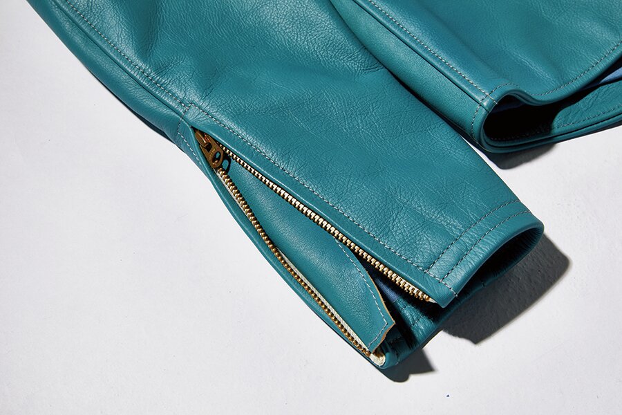 シャツジャケット感覚で着られるようシンプルなデザインで仕立てたコマンダー。きれいなターコイズカラーは、クロム鞣し&顔料仕上げなので、長年着用しても鮮やさをキープしてくれる。裏地にはシャンブレー生地を使い、春らしい軽い着心地が味わえる。17万500円