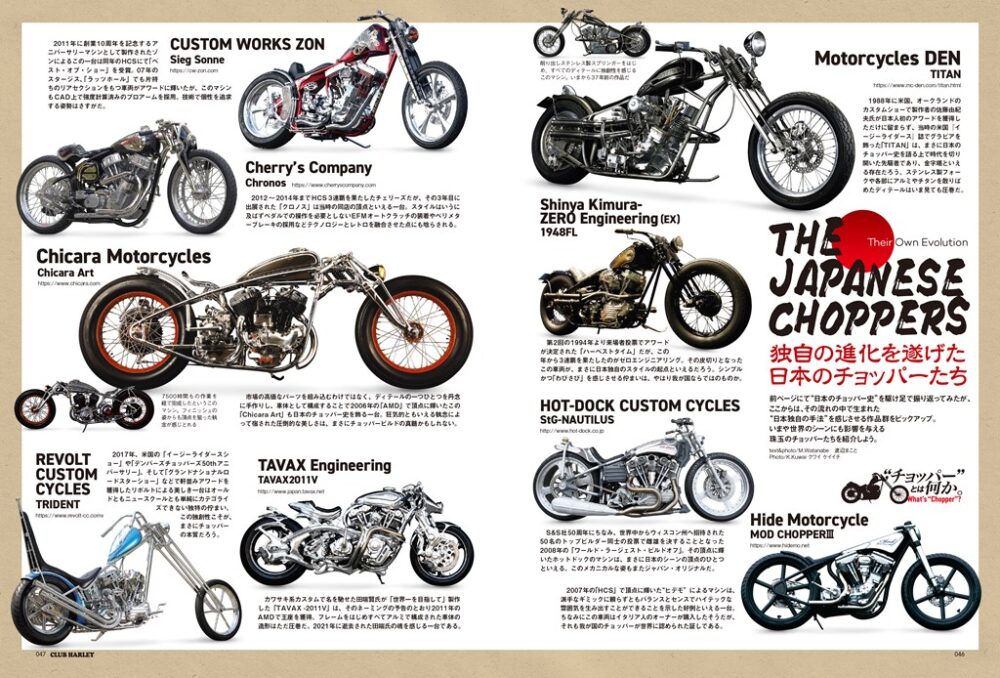 巻頭特集は「H-Dカスタムの王道 “チョッパー”とは何か。」です。長~いフロントフォークに天高くそそり立ったハンドルバー、そして後ろにもこれまた長~いシッシーバー。「チョッパー」と聞いたら多くの人はそんな感じのシルエットを想像するのではないでしょうか。