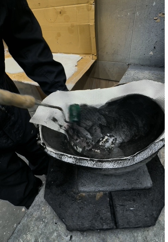 グラスファイバーを置いてレジンを塗る。この作業を数回繰り返すことで、グラスファイバーと樹脂の層ができ、より強固なシェルができあがる。