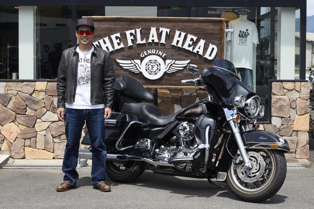 子どもを乗せて一緒に走るため、ツアラーをチョイス。先日も群馬・横手山にツーリングに行ってきたのだとか。コーディネートはフラットヘッドを軸に組み立て、雰囲気抜群の革ジャンはなんと10年モノ。ここまで着込むことで、エイジングにも迫力が宿る。