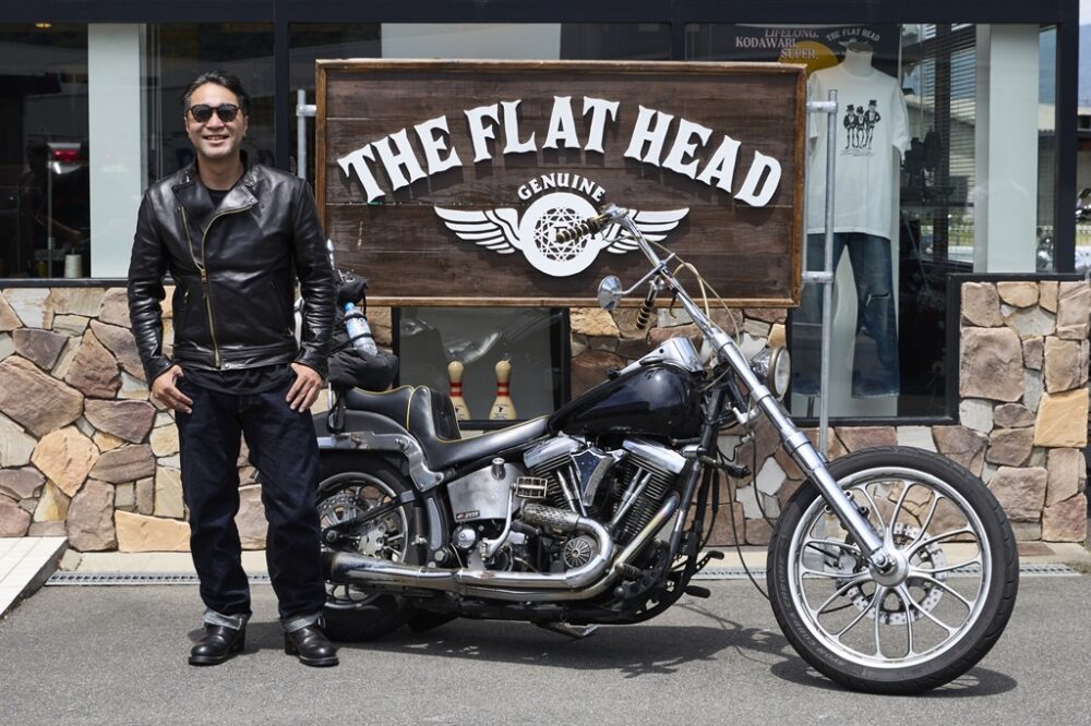 全身フラットヘッドでまとめ、雰囲気あるコーディネートを披露してくれた両角さん。インナーとデニムのブルーがバイクの外装とも調和し、統一感ある着こなしが洒落ている。シッシ―バーは60年代のヒッピーが使っていた当時モノで、悪魔の尻尾のような独特の造形がお気に入り。特注した6ベントのハンドルも存在感抜群。