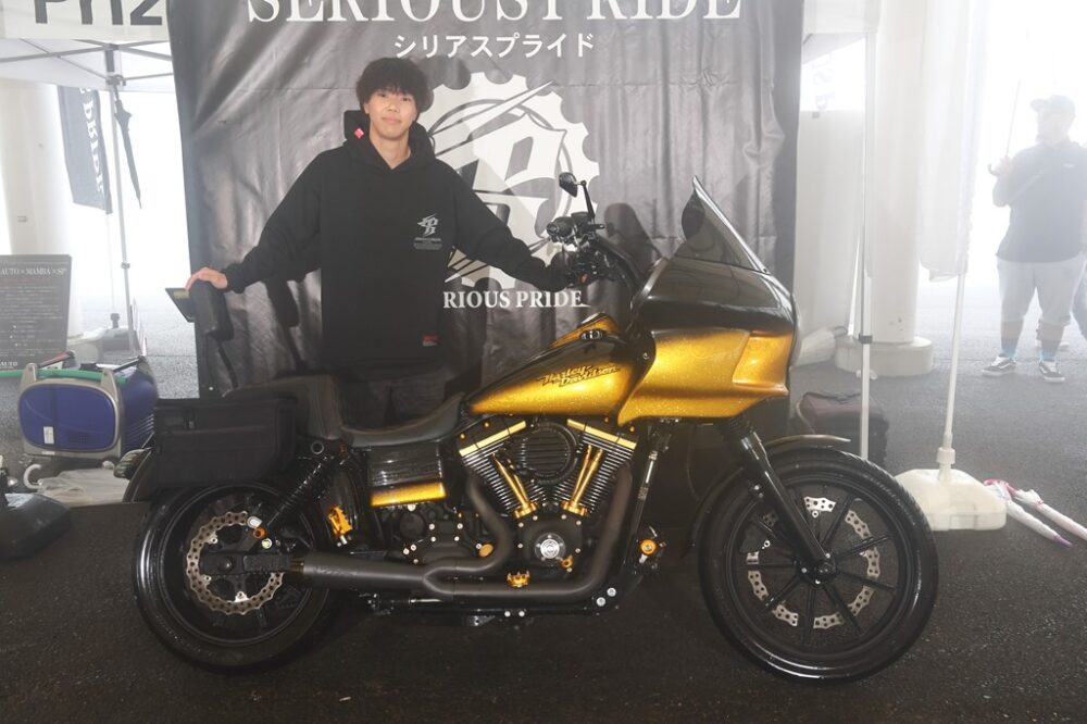 ダイナのベーシックモデルであるストリートボブにフルゲイン製RTカウルを装着したスピードクルーザー。グライド製ホイールにTBR製マフラー、ハンドルとシートはシリアスプライド製とフルカスタム。黒と金のグラデーション塗装に合わせて、各部にゴールドのパーツをあしらった。