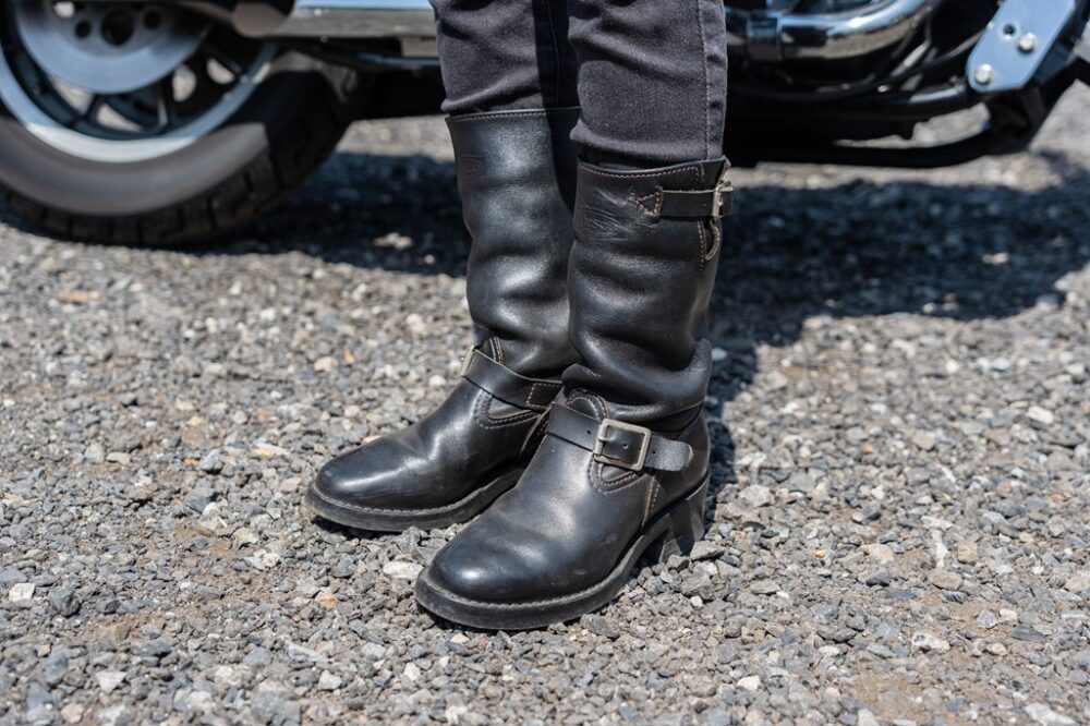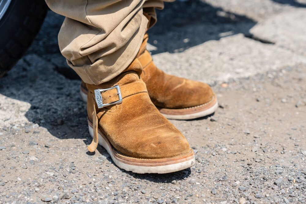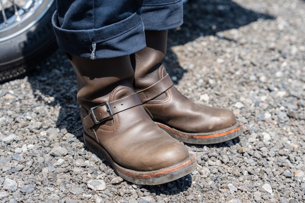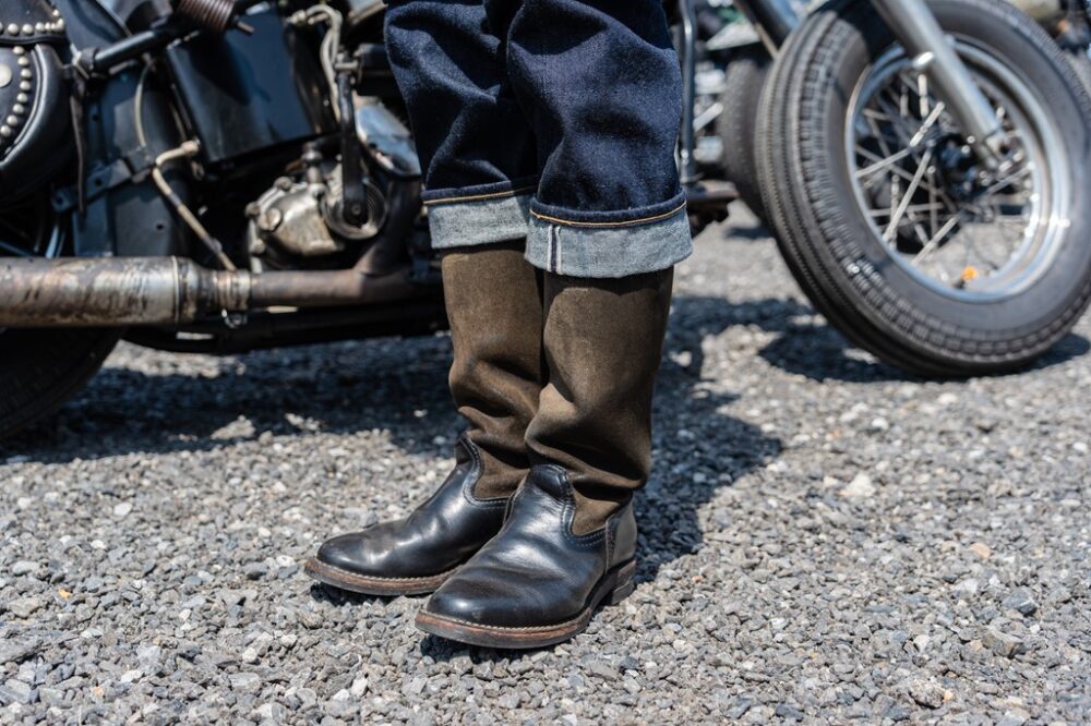シルバージュエリー界の重鎮、「リンチシルバースミス」の矢野達也さんは奥様とFタンデムで参加。達也さんの足元はリンチシルバースミス×ウエスコの3rdコラボモデル。奥様は細めなパンツをブーツインした女性らしいボスの履きこなし。