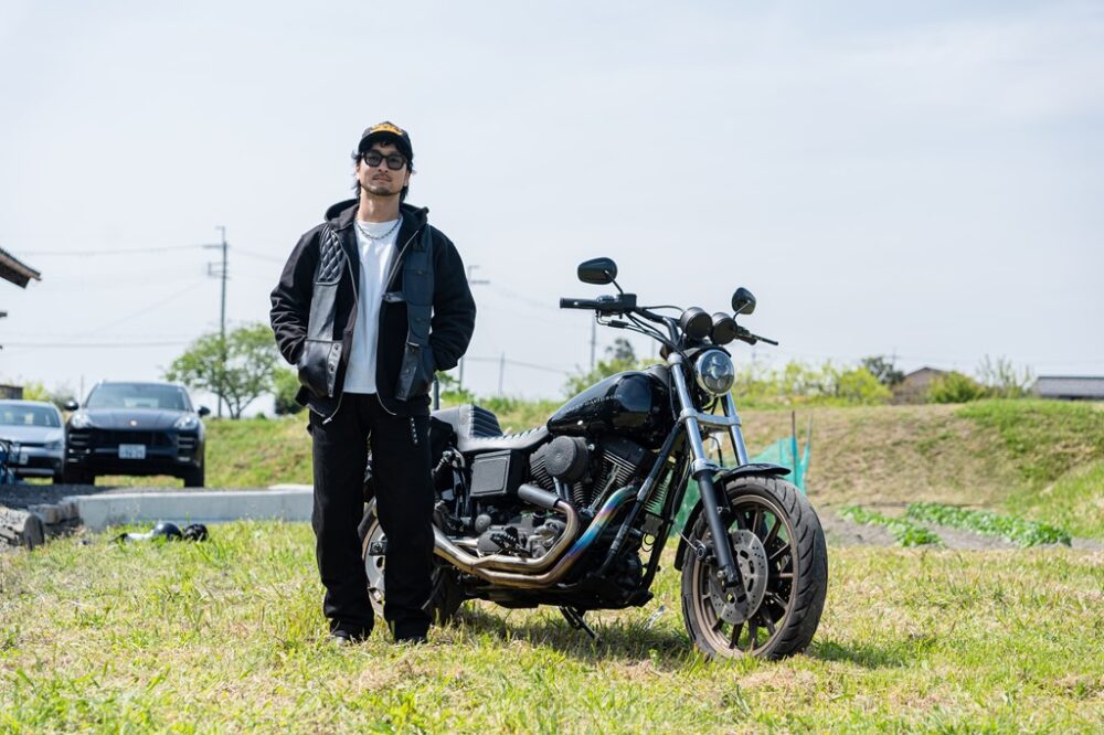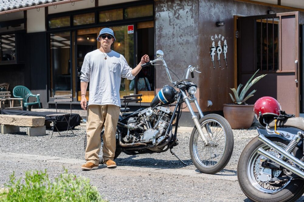 タンクからハイバックのリアフェンダーまで一体ボディのスキニーな車体に、S&Sナックルを搭載するチョッパーは「ZON」が製作したカスタム。バイクに乗るときのブーツはブラウンレザーのボスがフェイバリット。