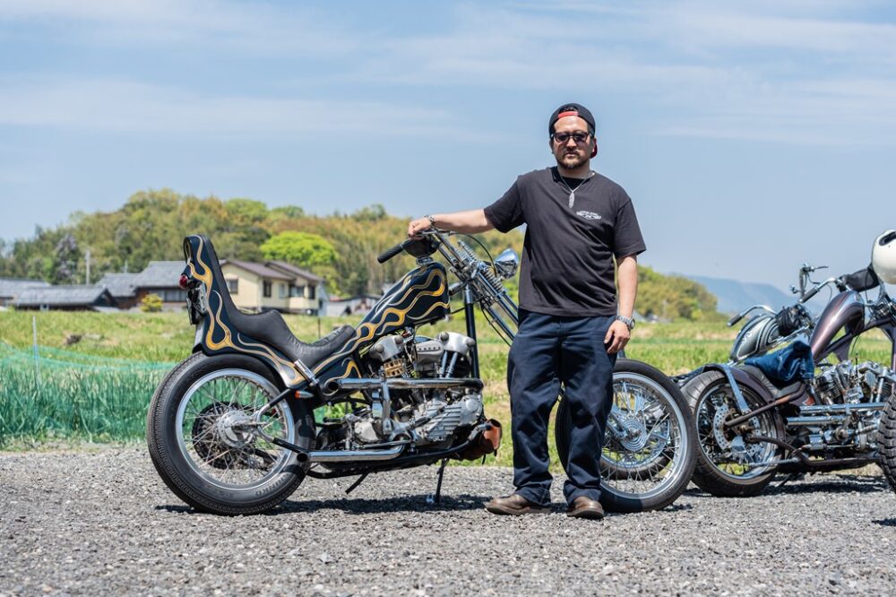 アーリーショベルのチョッパーを愛機とする戸髙さんは、ウエスコジャパンのクラフトマン。足元は、ラフアウトのモリソンをベースに、ラウンドトゥやボスのロングストラップなど、こだわりを詰め込んだ一足。