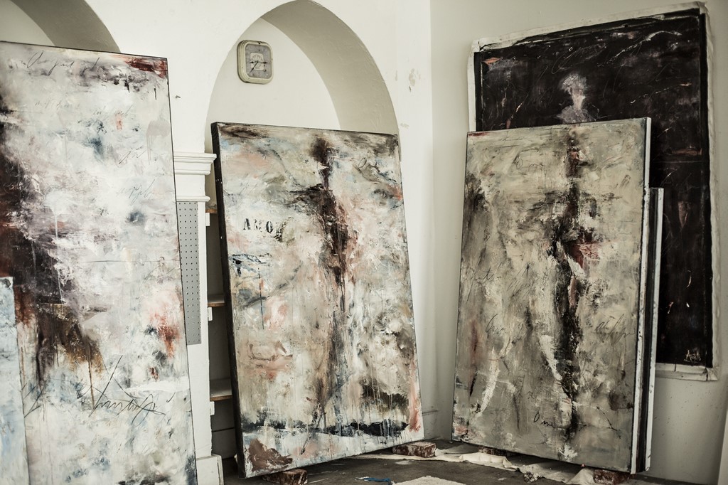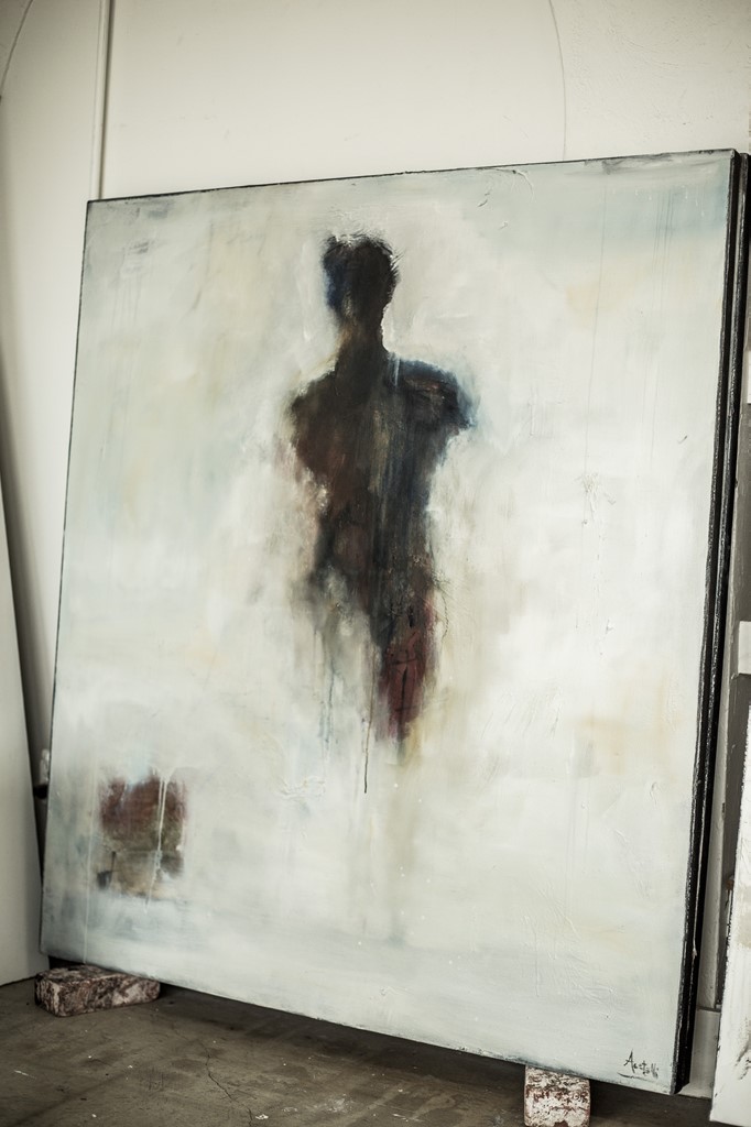 残像のようなシルエットが描かれ、背景の白に溶けていく……アトリエに置かれた作品はどれもが同じテーマで描かれていた。