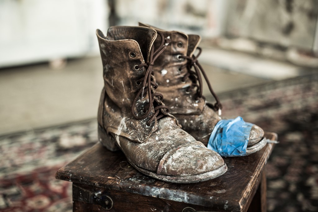 もはこれがアートなのでは? と見紛うばかりの15年前に買ったブーツ。一度ペイントが入ったバケツをひっくり返してしまい汚れた時から