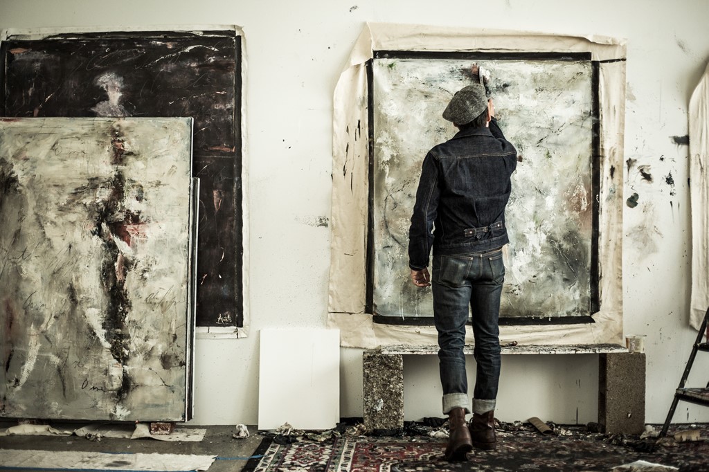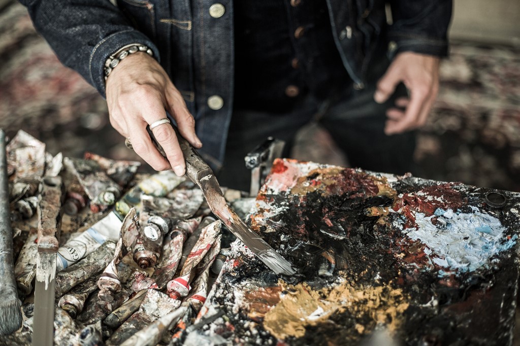 筆はあまり使わず、ヘラやボロ布、手を使って描く。独学で学んだことが、このユニークなスタイルを生んだ。