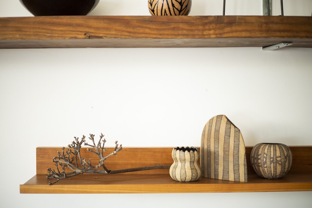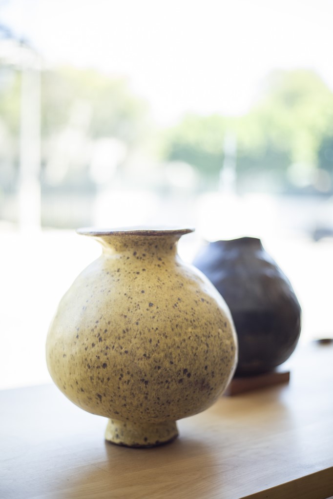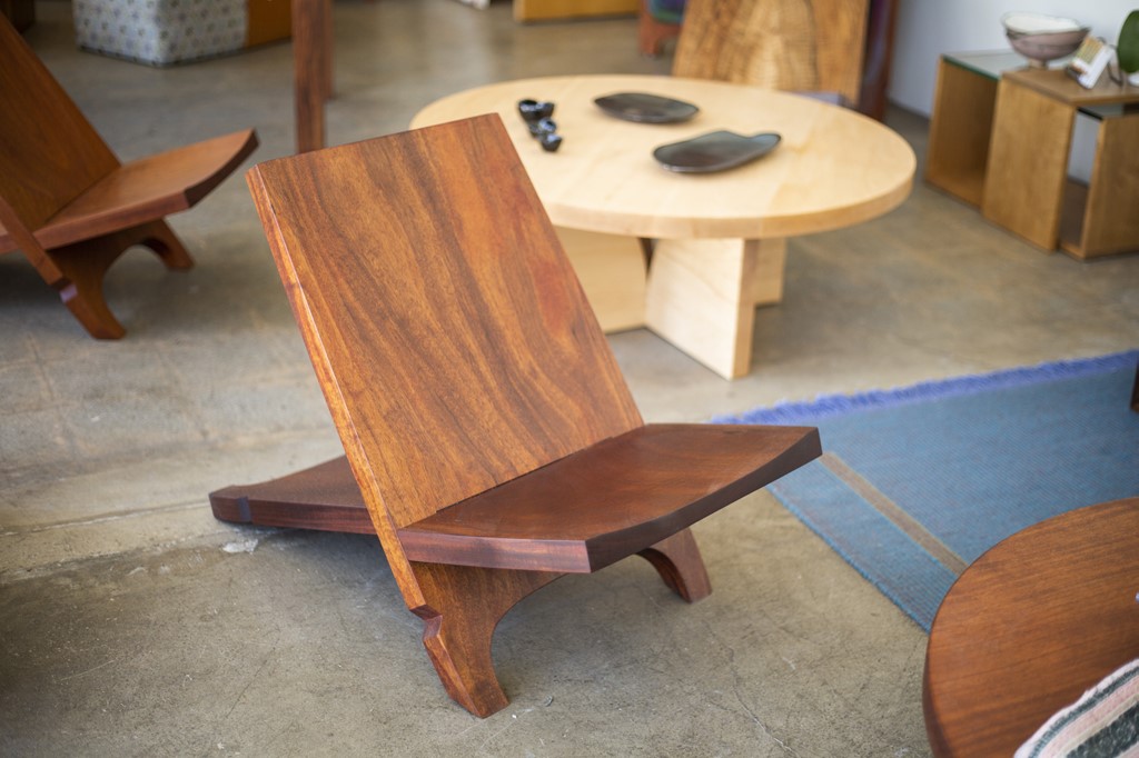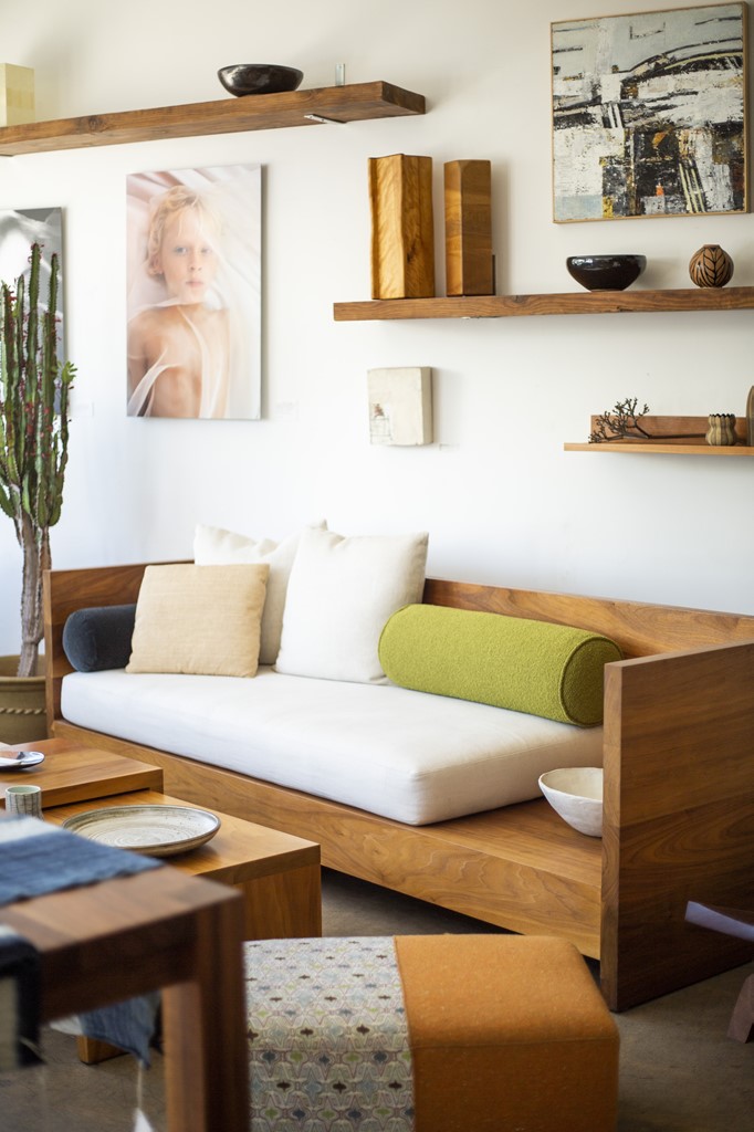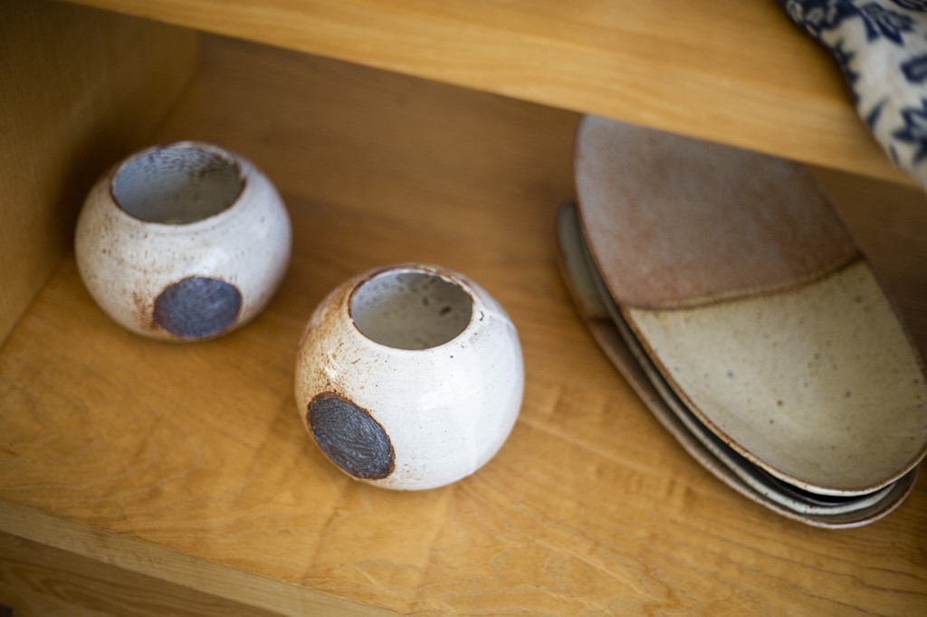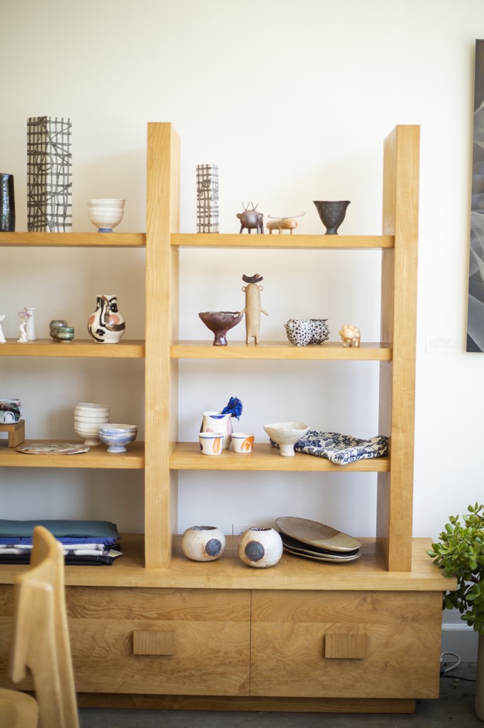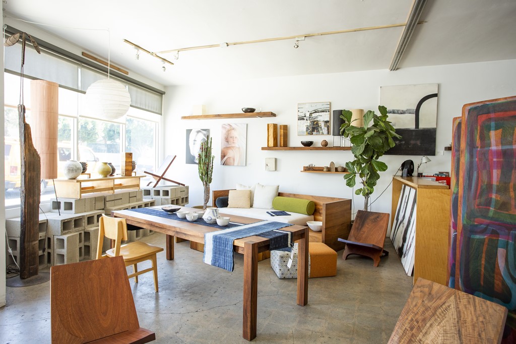 店内に置かれた、西海岸を中心に活躍するアーティストによる器やテキスタイルなどインテリア雑貨の数々。どれも個性的で、ひとつ置くだけでインテリアのポイントになってくれそうです。無垢材を使った家具とも雰囲気がぴったりで、ぬくもりが伝わってくるのが魅力的に感じられます。