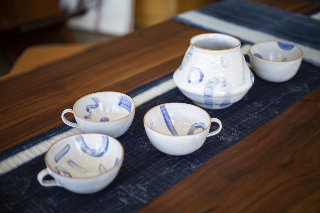 こちらのティーセットはちょっと日本の器のような雰囲気。テーブルランナーと無垢材の家具の色合いともマッチしていて、おしゃれですね。
