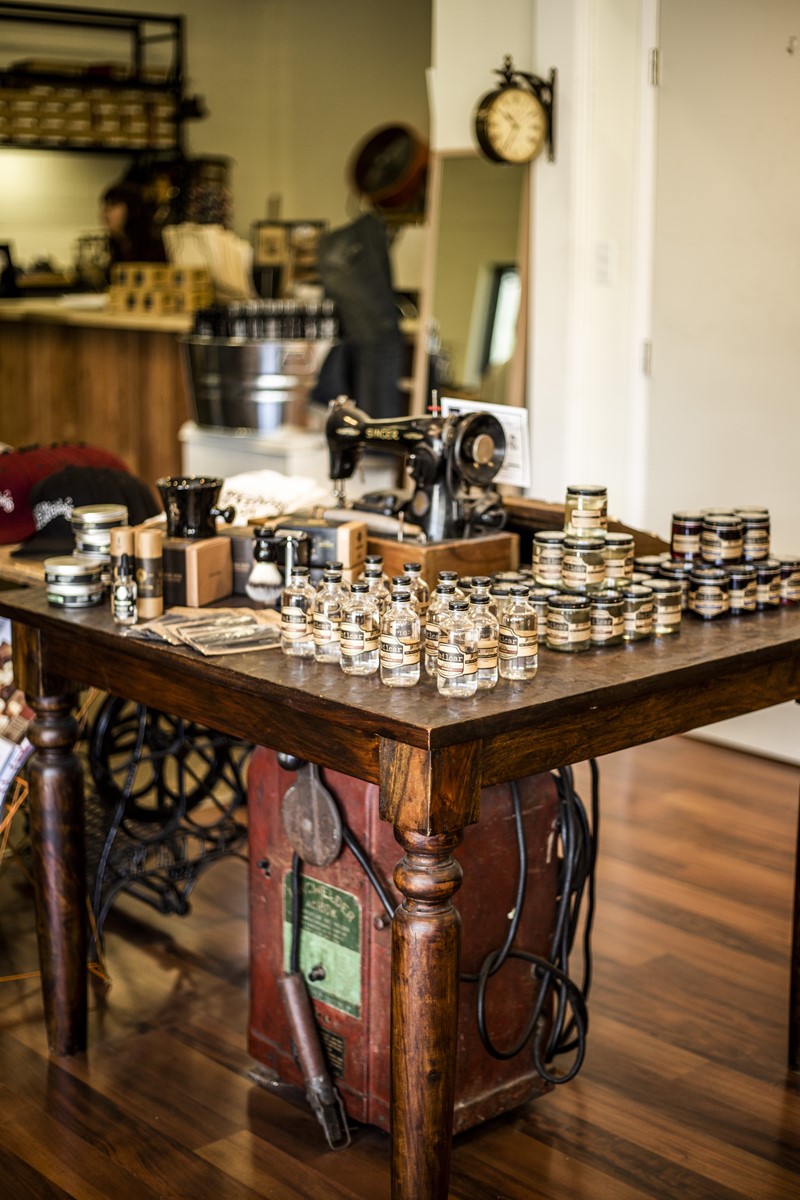 ミシン台をリメイク?したテーブルにディスプレイされたグルーミングアイテム。こちらも参考にしたくなりますね。このミシンが置かれているわけは、この奥にある店が関係しているのです。