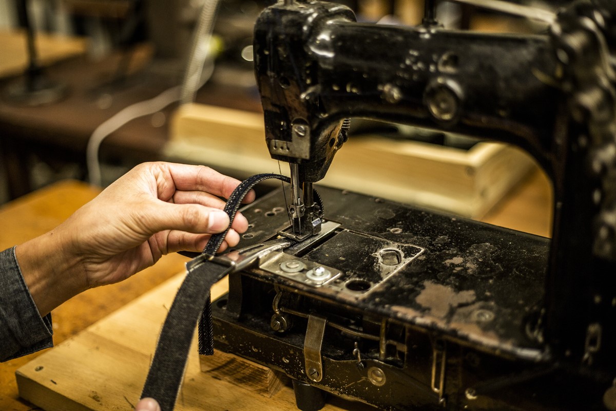 古い工場から見つけてきたという、ベルトループを作るミシン。動くように直して、ベルトループ作成用に改良したもの。