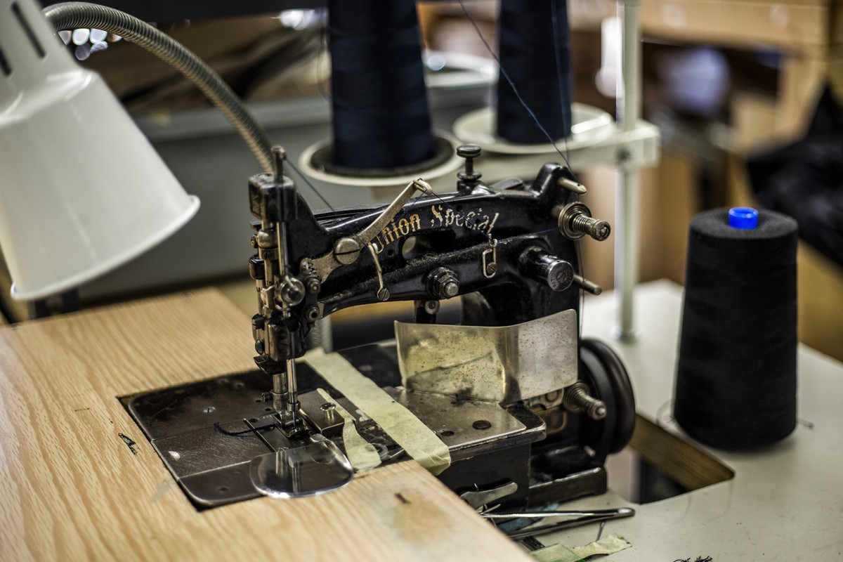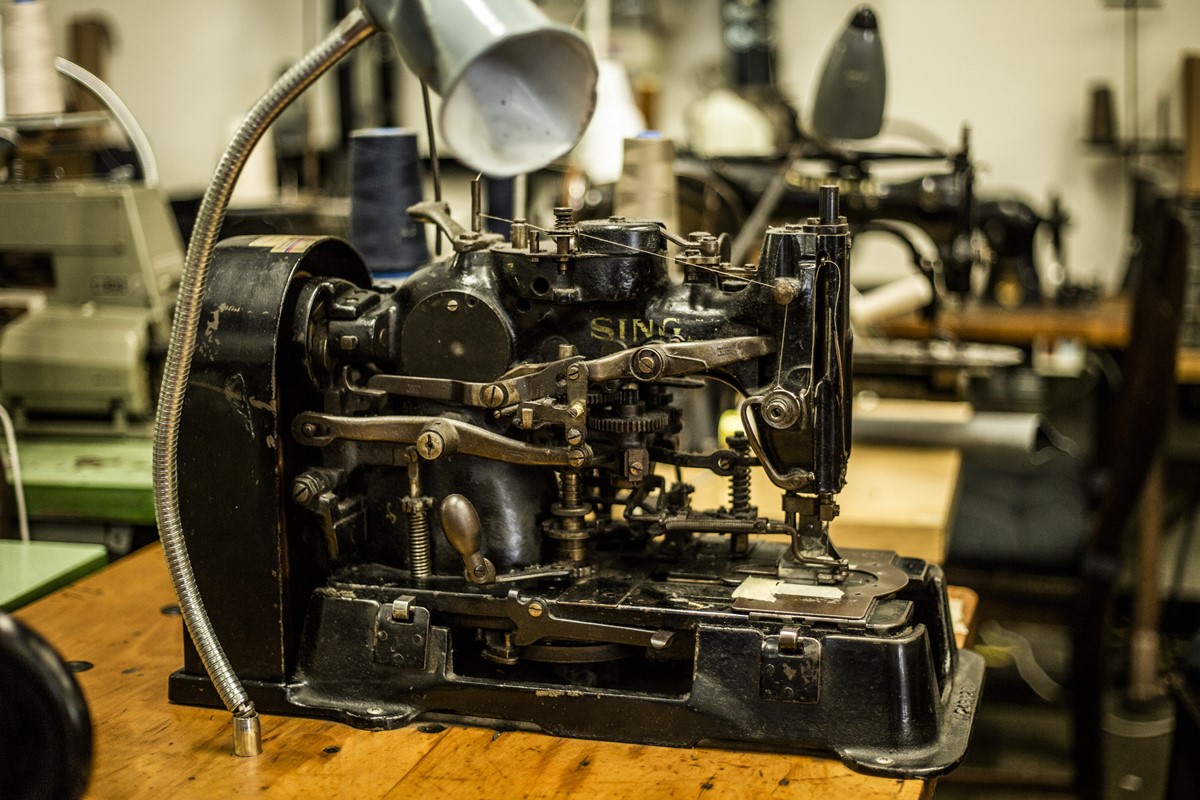 古いミシンがずらりと並ぶ作業場。現行のミシンでは出来ない縫い付けも、旧いミシンだと可能となり、より丈夫でより長持ちする物作りを目指しています。ここからは、その旧いミシンたちを見ていきましょう。