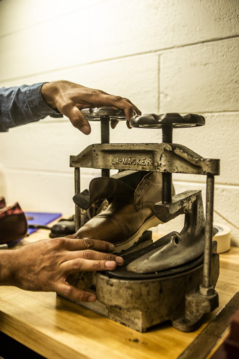 靴職人もいる。これは、靴本体とソールの部分をくっ付けるShoe pressという機械と、靴修理用の道具たち。