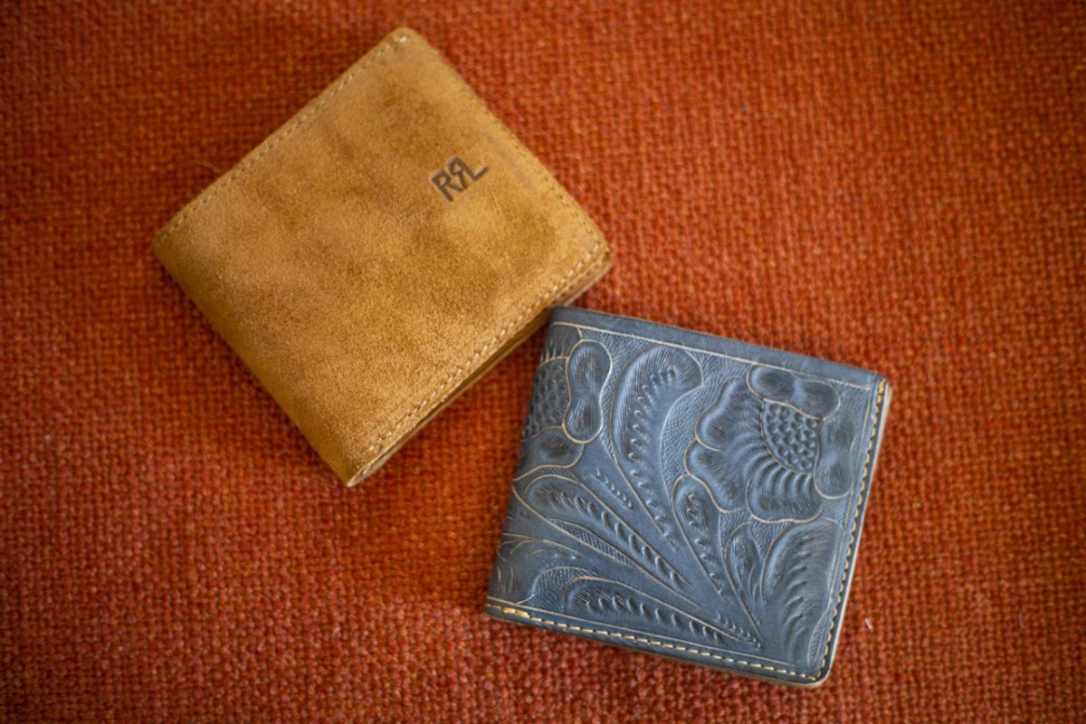 フルグレインスエードの茶色の財布。ROUGHOUT SUEDE BILLFOLD LIGHT JAVA $265.00 そして、ベジタブルタンの牛革、インディゴ染めが美しいTOOLED INDIGO LEATHER BILLFOLD $295.00