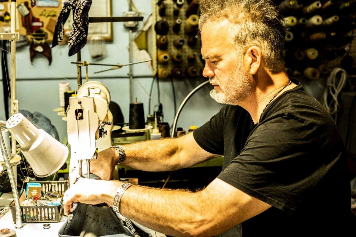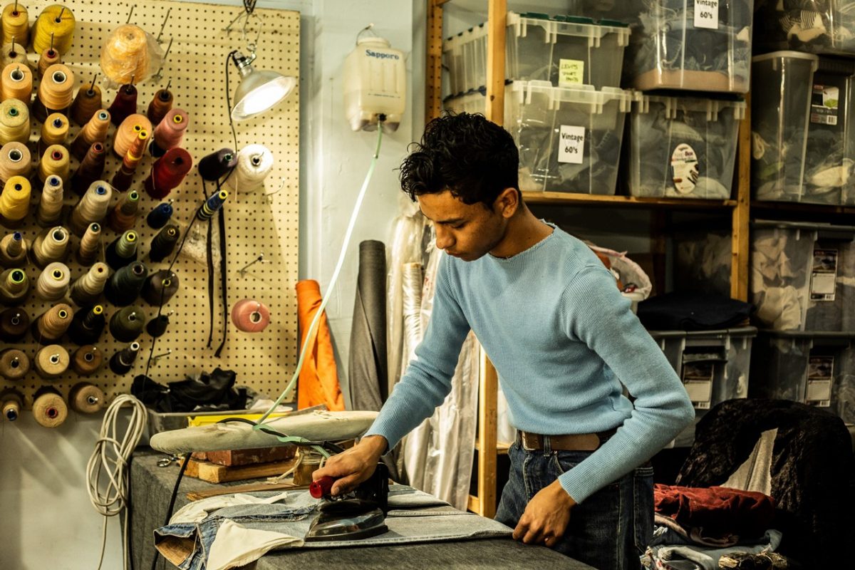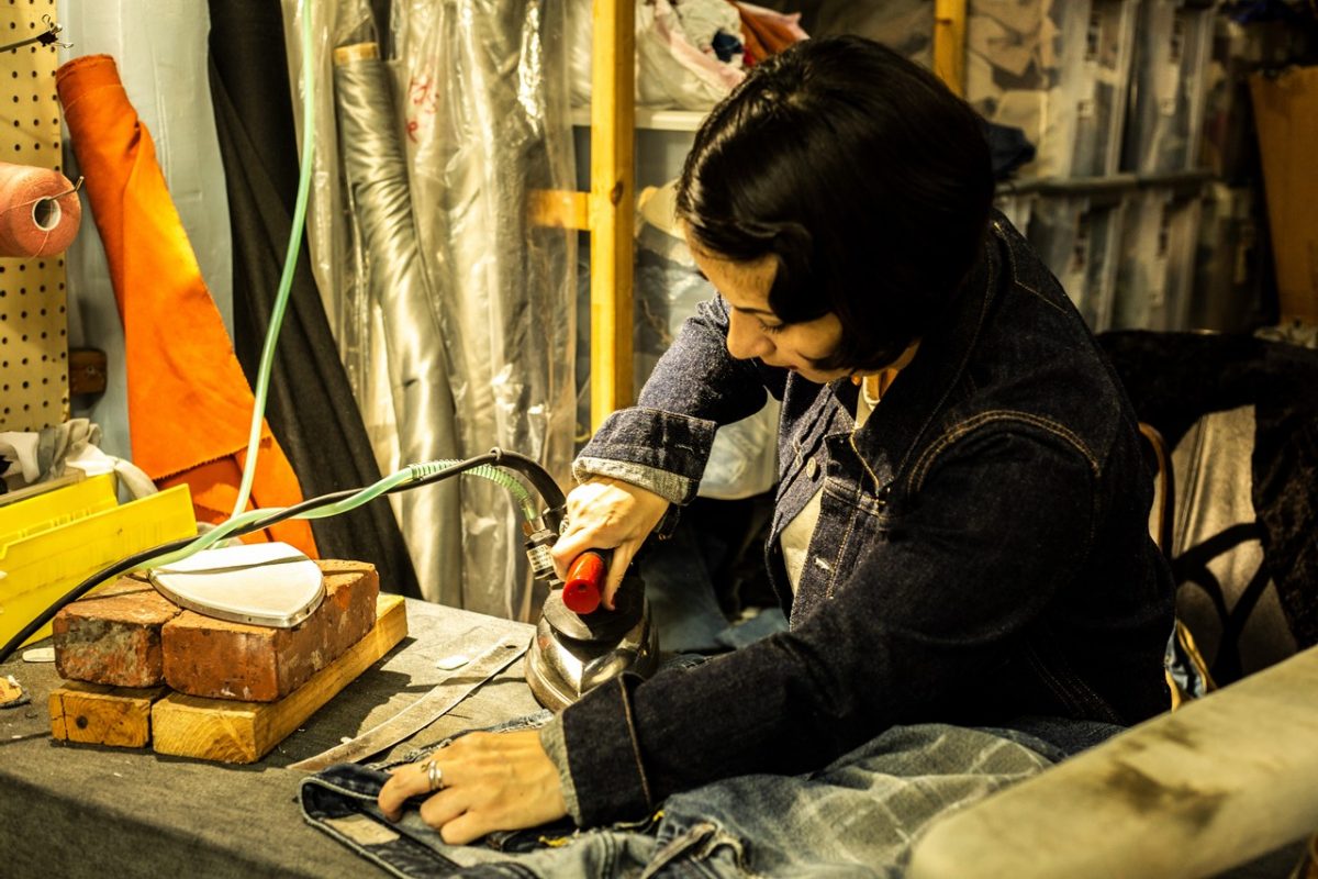 ショップ奥の工房ではこの日も様々なデニムがせっせとリペア されていた。