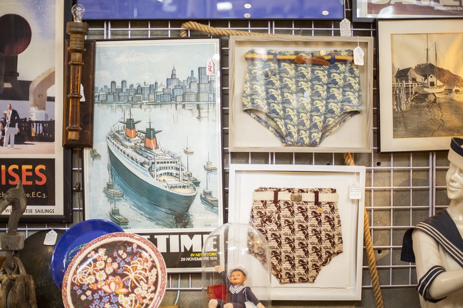 額に飾られている水着は、40年代のウール製の水着。未使用……だよね?