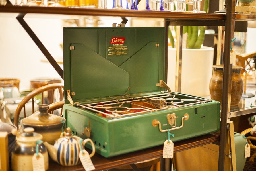 コールマン製60年代のガスストーブは未使用! インテリアとしてもかわいいですね。