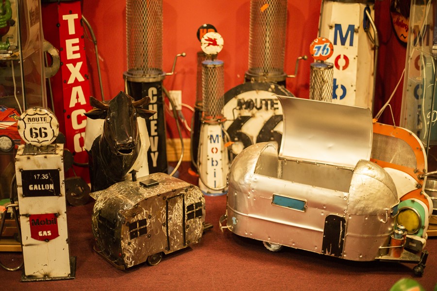 ブリキでできたエアストリームにキャンピングカー、ガソリンスタンドの置物。