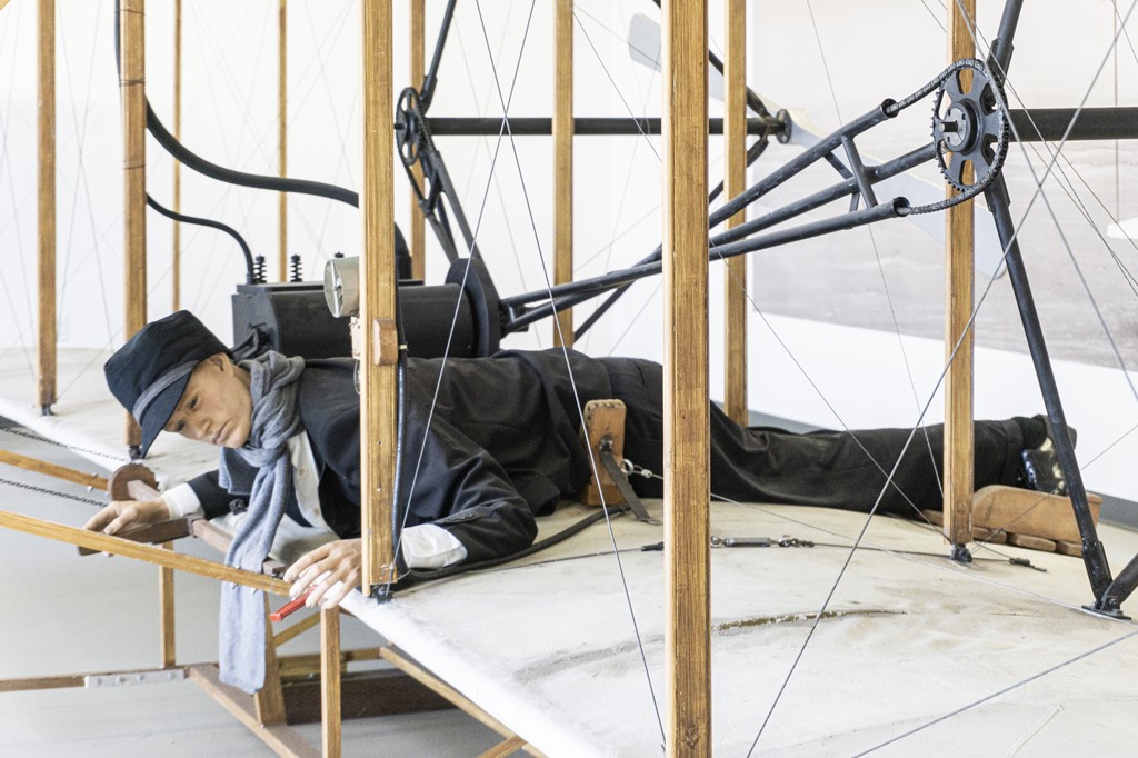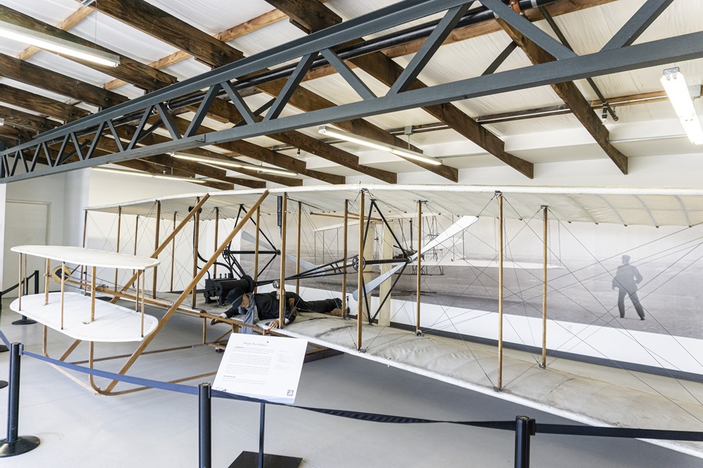 はい、こちら。歴史的な飛行機のレプリカです。なんだかわかりますか? 1903年に世界初の有人飛行を達成したあのライト兄弟が作った飛行機を再現したものです。12秒で120FEETという記録を打ち出しました。こちらも映画「Night at the Museum」で使われたもので、「20th Century FOX」から寄贈されました。