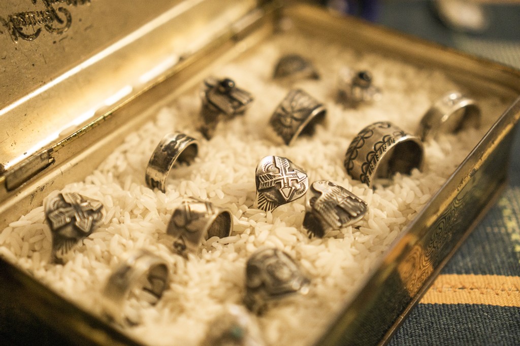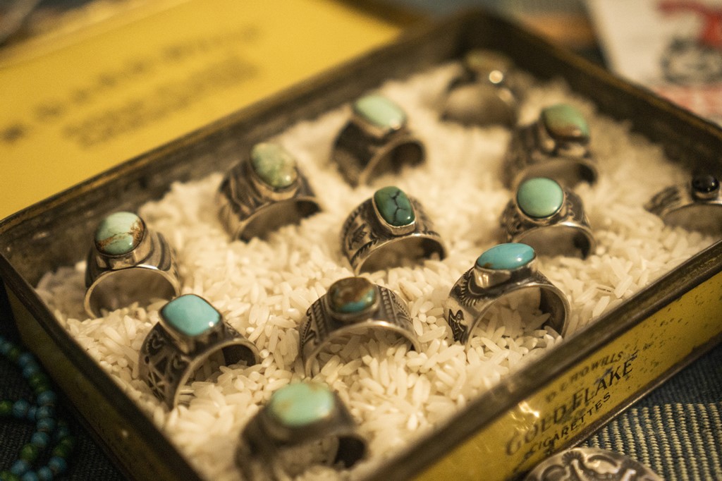 お米を詰めた缶にリングをディスプレイしていて面白い!