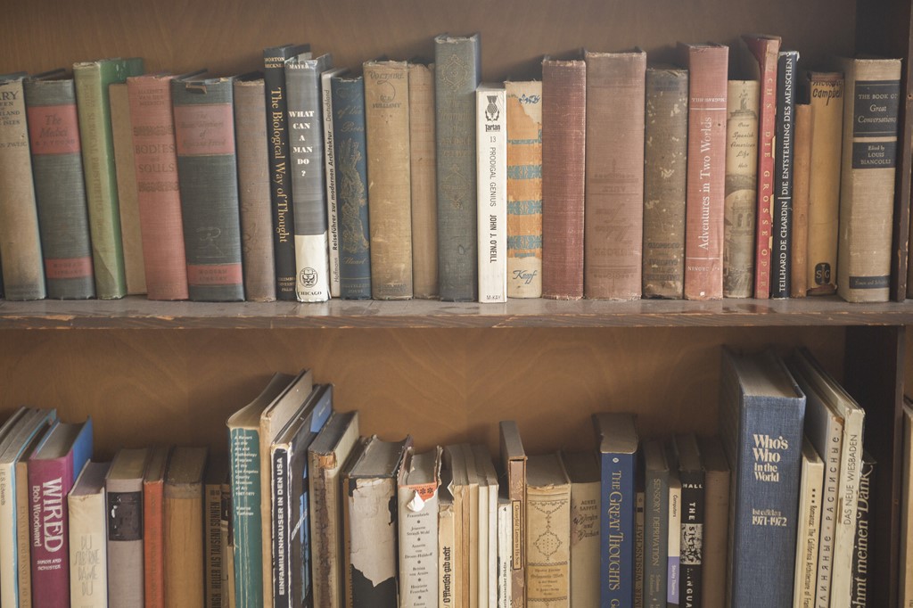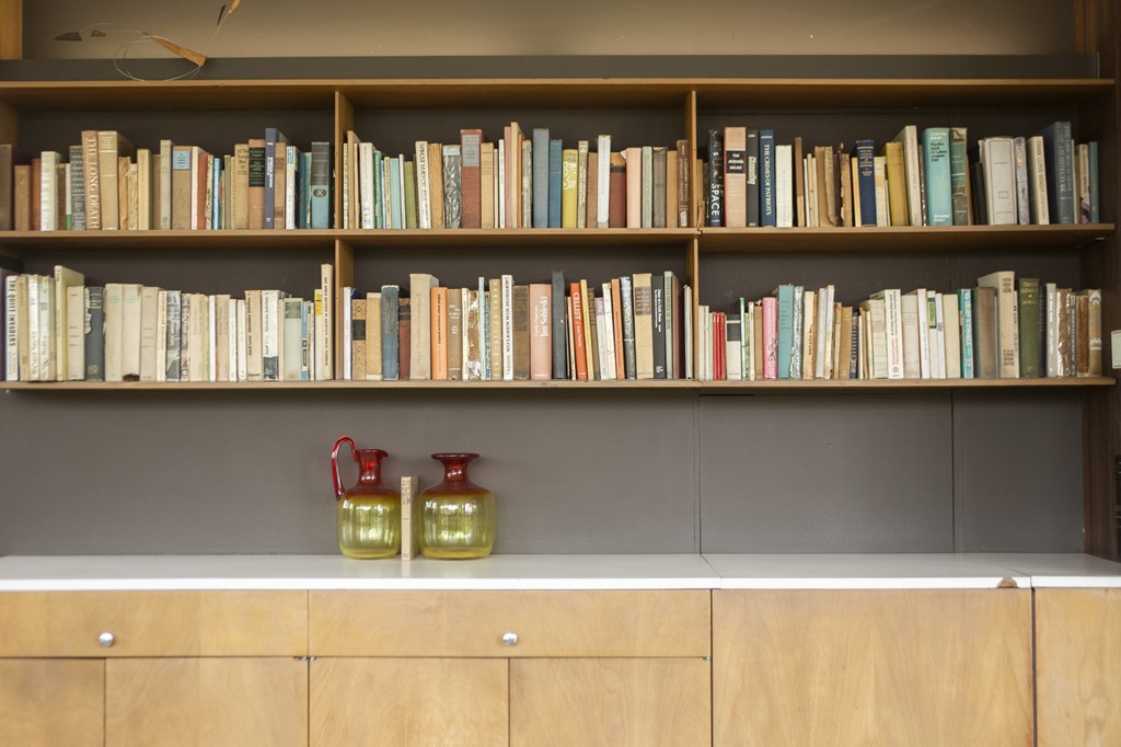 ソファ、本棚など、家具の多くが備え付けになっていて、これは、空間をより広く見せるためのデザインなんだそう。本棚には住んでいた当時の本が並びます。
