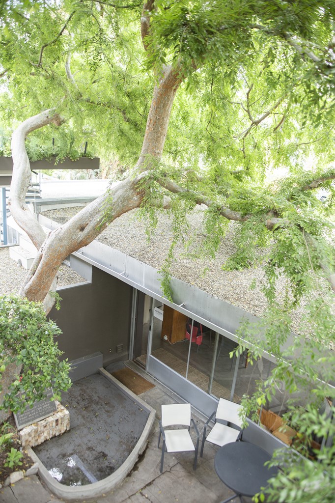 賑やかなシルバーレイクの中心地からは少し離れ、自然豊かで静かなエリアにあります。緑に溶け込んでいて、どこまでが敷地かわからないほど。