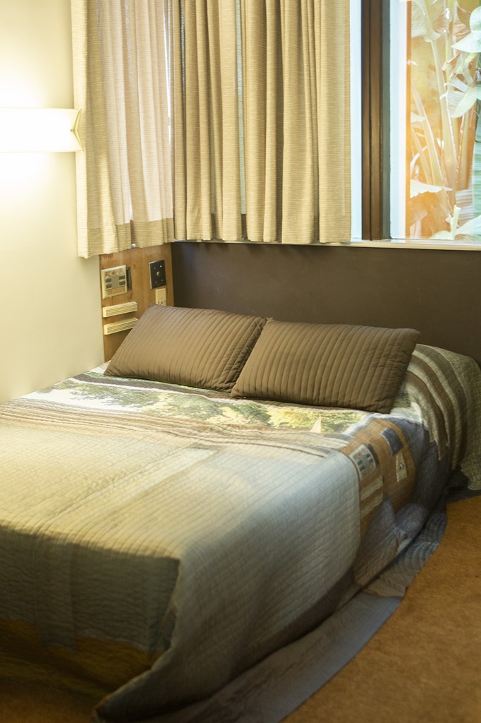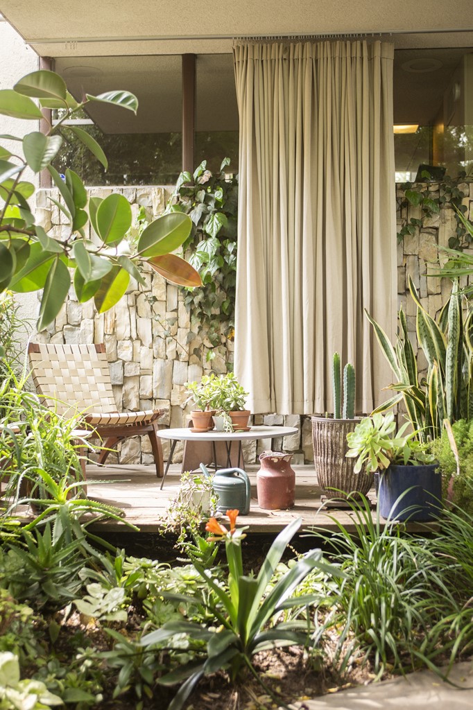 カーテンが、室内でなく外のパティオ側についている! 室内は屋外のように、屋外は室内のように感じるのは、きっとこういった細かな工夫があってこそ。随所にこういう面白い工夫があって、見ていて飽きない。
