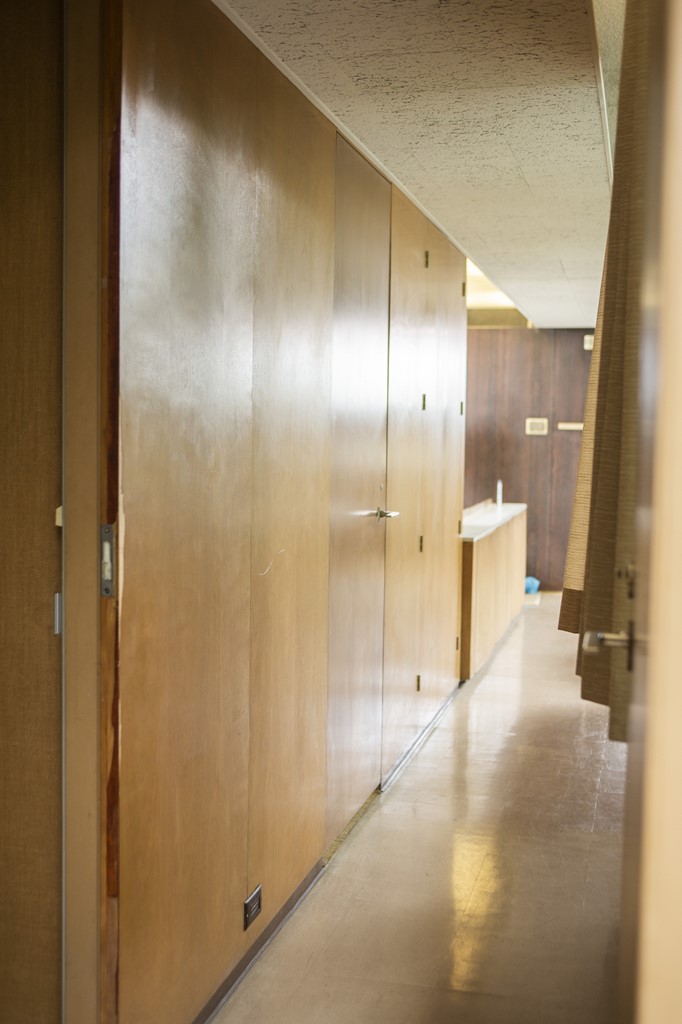 廊下は壁と扉の区別がつかないような、こちらもまたミニマムなデザイン。反対側の壁はガラスになっていて、パティオが見下ろせます。