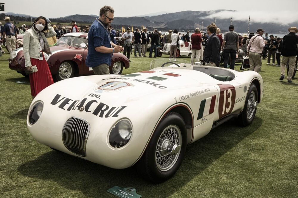1952年式Jaguar Cタイプ・ロードスターは当時の公道レースであるカレラ・パンアメリカーナ・メキシコを走ったカラーリングが特徴的。右ハンドルのままアメリカで生存する。