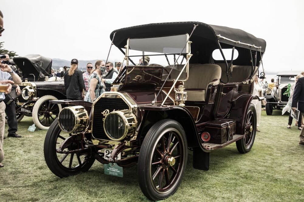 アメリカのクリーブランドで生まれたPeerlessの1910年式。この頃は馬車の延長線上に自動車が存在していたことがわかるデザイン。