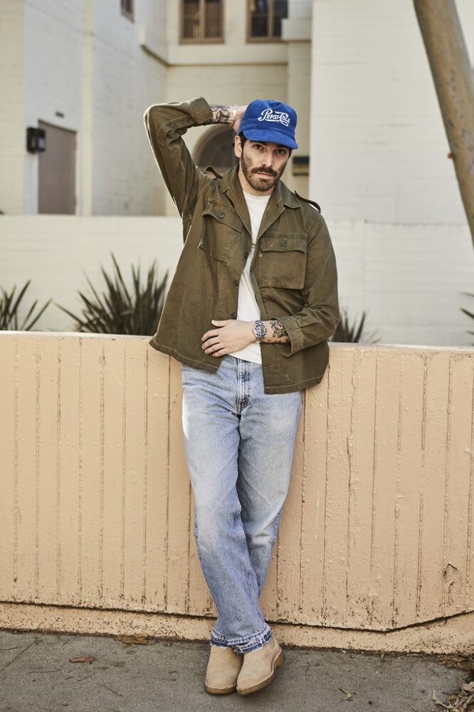 OTHERS: Vintage bracelet from Rose Bowl, Vintage necklaces from Santa Monica Flea, Reginald Submariner Homage watch, Vintage Pepsi hat from Fine and Dandy Vintage (NYC)