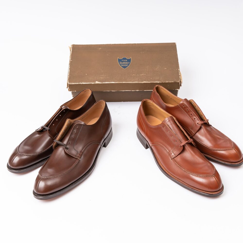 飾りのモカがアクセントになったVチップのモデル。色味の深い茶色は、ブランドではブラウンヘザーカーフというネーミングで販売されていた。デッドストック。