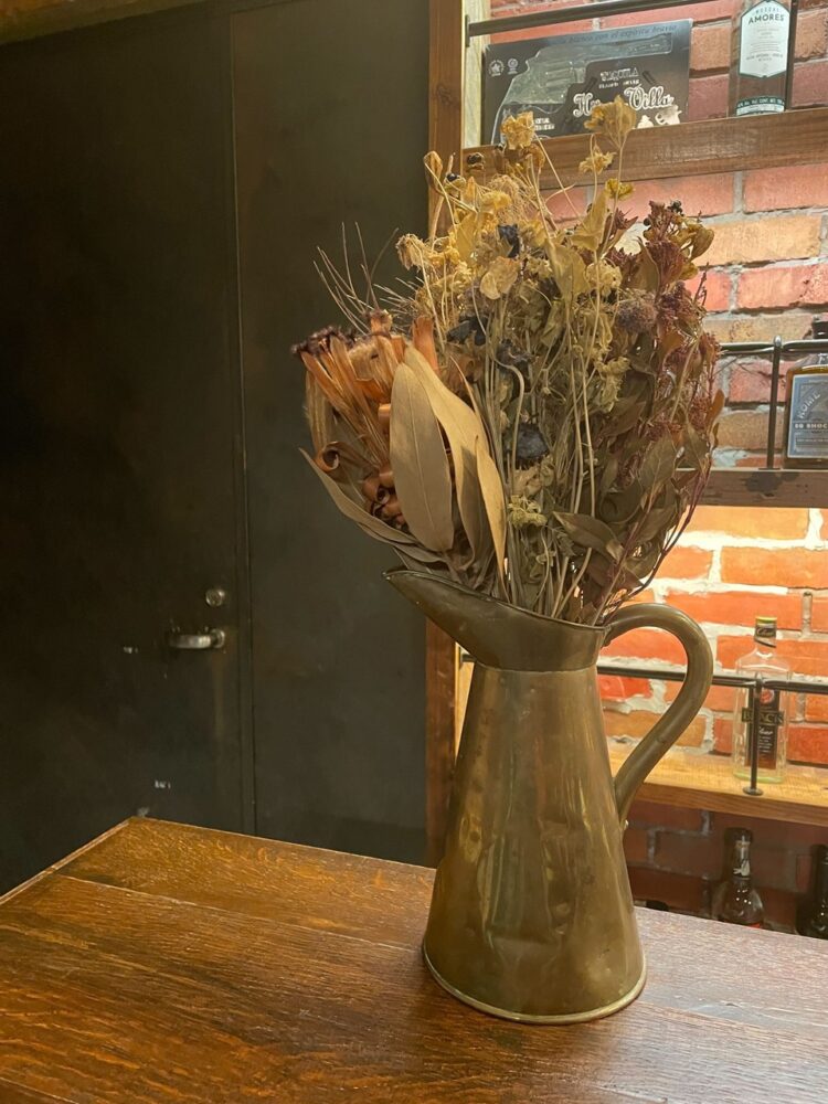 これは生花同様で、花束を挿してもいいし、一輪挿しにしてもいい。花瓶にこだわって全体の構成を考えよう。アンティークの水差しを花瓶代わりに使ったものがコチラの写真。水差し自体がブラス製なので、ドライフラワーとの相性は抜群だ。