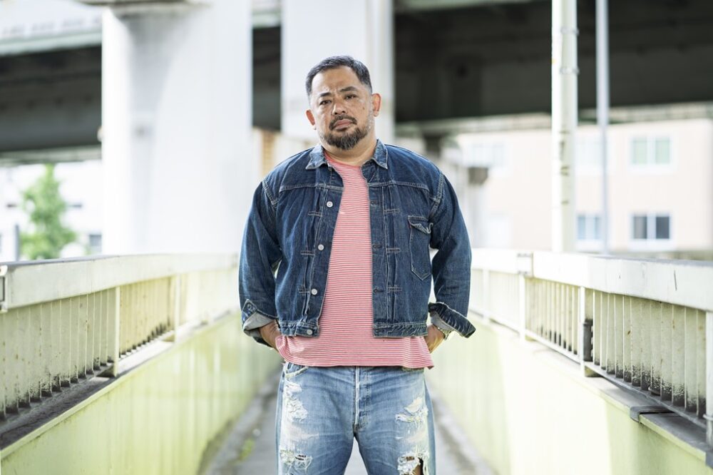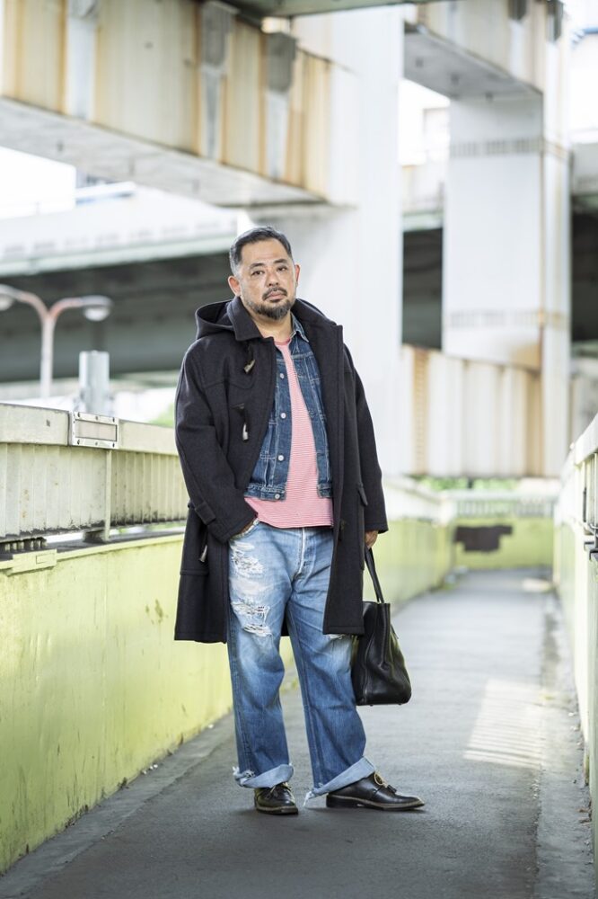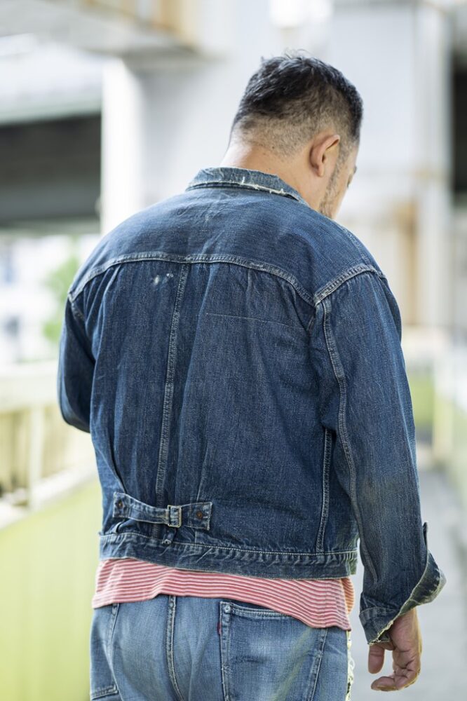 25年前に購入したLEVI’Sの1stモデル。ビッグサイズのみの仕様であるいわゆるTバックと呼ばれる背面が特徴だが、当時は背中の接ぎのデザインが「嫌やな」くらいにしか思っていなかったという。インナーに着用の赤のボーダーTシャツはPOLO SPORT。「Gジャンは、もっとバッキバキだったんですけど、普通に着てこの色落ちに。茶綿を使ったデニム生地は、独特なインディゴの深さがあるので好き。Tシャツは、22年前、当時10歳だった長女からの誕生日プレゼント。そのときの父のイメージは赤だったみたい」