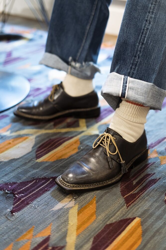 27年ほど前に妻からサプライズでプレゼントされたイタリア靴の名門STEFANO BIのシューズ。「元々は黒だったんですけど、経年変化で茶芯が出てきています。ドレスシーンで履くわけではなく、普段ジーパンに合わせることが多いから、ワークっぽいツラになっているのも好き」