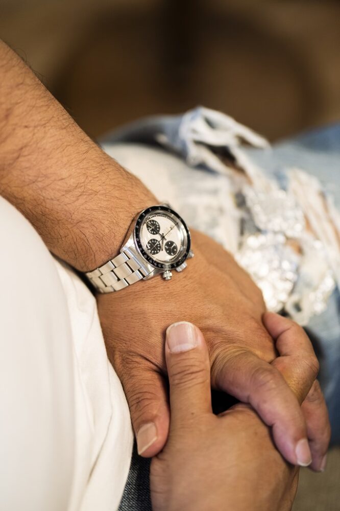 歴代ROLEXのなかでも別格とされるポールニューマンモデル。なかでも超希少なCartierとのWネーム。「当時から最高峰の時計として知られていた1本。ジーパンはもちろん、どんなスタイルにも合わせやすいですが、最近は気軽に着けられなくなりました(笑)」