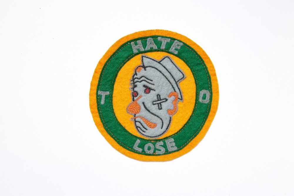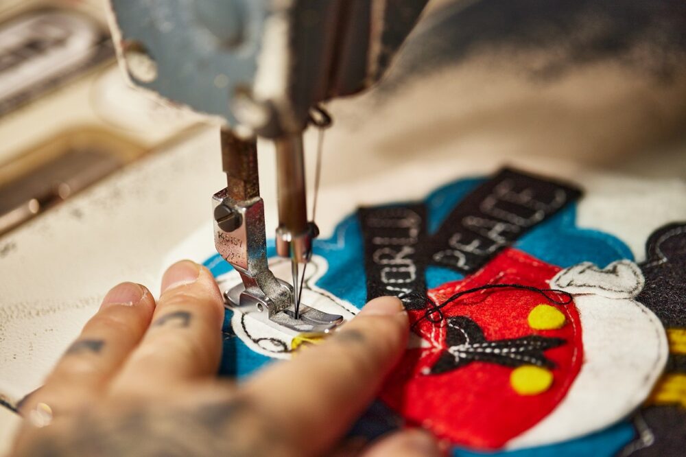 重ねたフェルトはミシンで1箇所ずつシングルステッチで縫製していくこだわりようで、最後にコーヒー染めで経年による風合いを再現することで、唯一無二のフェルトワッペンは完成する。