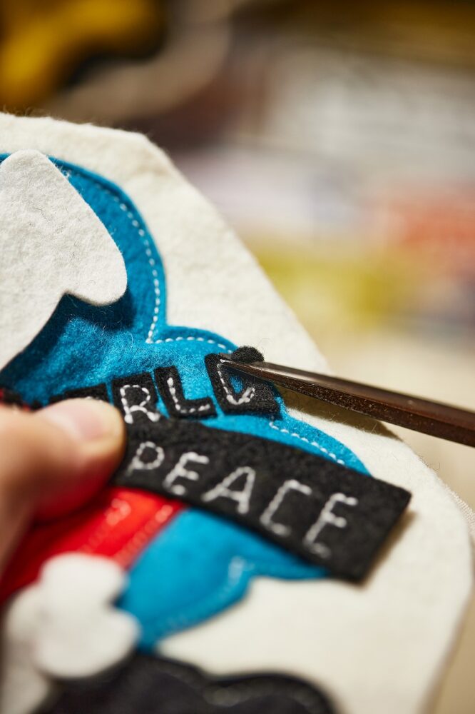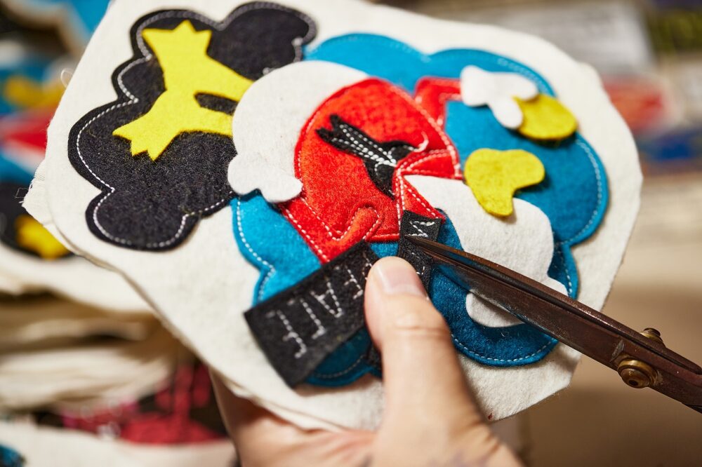 フェルト地を文字ステッチで縫い付けた後、文字の形に合わせて切り出していくのだが、堀川氏は生地用の裁ちバサミを器用に使って仕上げる。