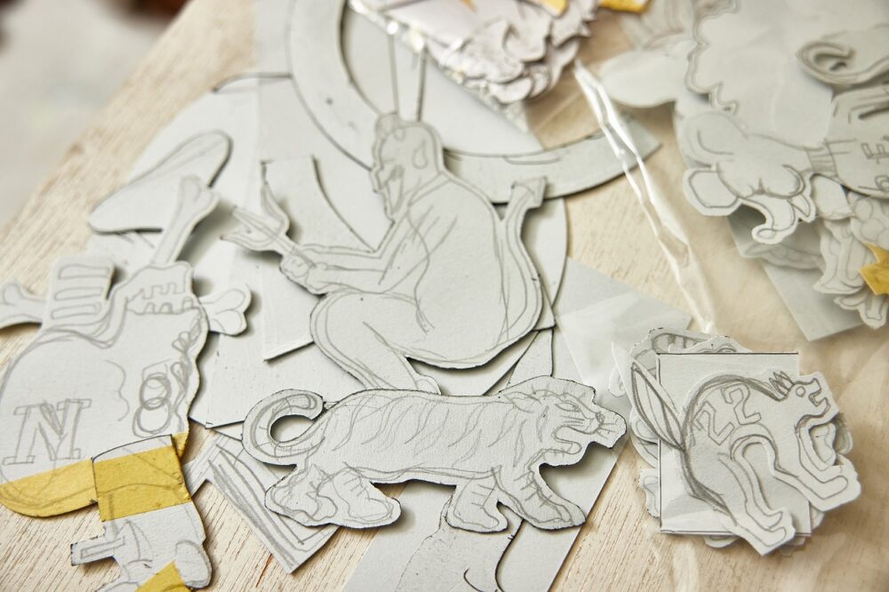 今季の新作のものになった手描きの型紙。ワッペンを作る前に、思い描くデザインをこのようにスケッチするところから作業は始まる。すべて堀川氏の直筆だ。