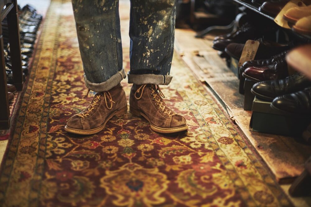 憧れの先輩から譲り受けたモンキーブーツ。外羽根式でシューレースの歯とめがトゥまで装着された特徴的なデザイン。「ワークブーツは昔からひと癖あるモンキーブーツが好きで10足以上、タイプ違いで所有。季節問わず、夏でもガンガン履いています」