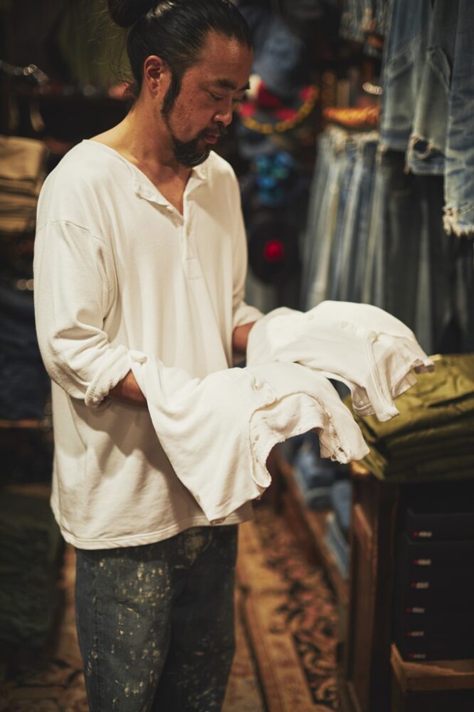 ヴィンテージのヘンリーTシャツは桒原氏を象徴する定番アイテムのひとつ。1940年代から1960年代くらいまでの年代問わず集めている。「毎年、良いコンディションのものを見つけては買い足しているアイテムです。ボクの中ではどんなアイテムにもハマってくれる白飯のよう」