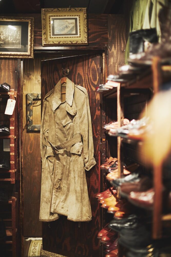 初めて英国に買い付けに行った際、ロンドンのコレクターから譲ってもらったBritish Armyのディスパッチライダーコート。「多くのブランドがサンプリングしていることで有名な英国陸軍の名作。ニットの上から羽織るくらいが好きですが、カットソーの上からラフに着ても絵になるコート」