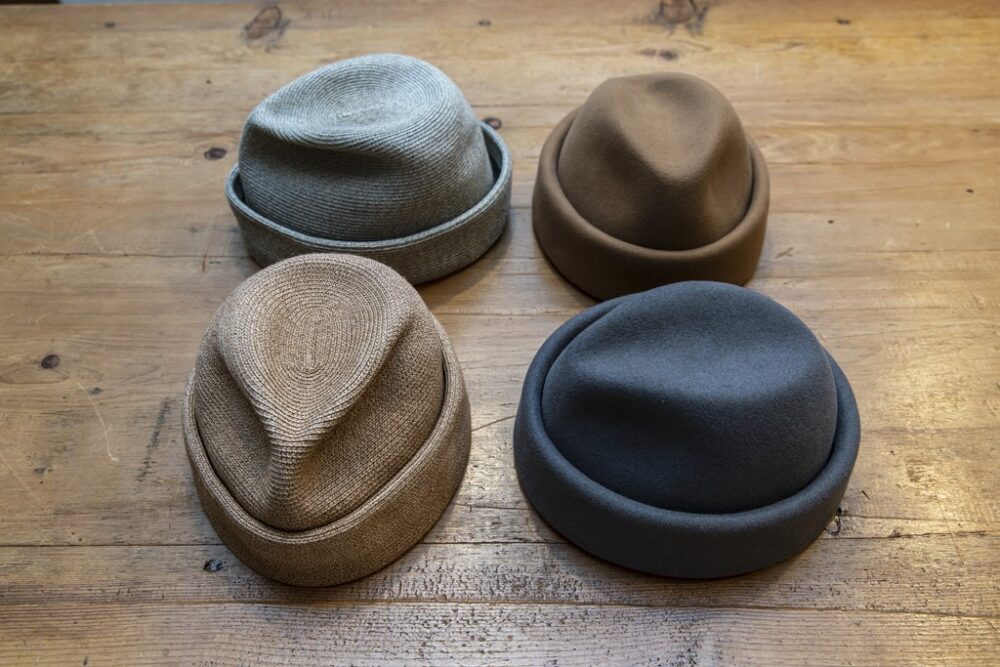 田中氏のアイコンにもなっているギャリソンキャップは、日本を代表するハットメーカーであるKIJIMA TAKAYUKIのもの。「ここのギャリソンキャップは、複数持っていて、自分には欠かすことができない存在。左のペーパーはインラインでリリースされたもので、右のメルトン素材はショップの別注。このアイテムを作る際にお声掛け頂き、特別に作ってもらったスペシャルオーダー」
