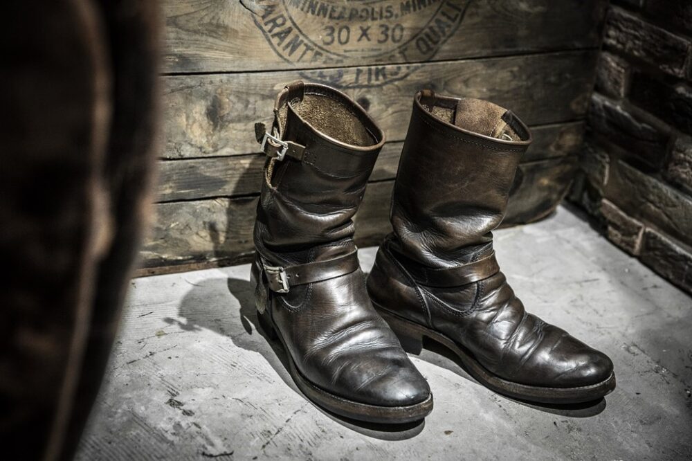 アローエンジニアブーツの初期モデル。「染色した黒が抜け、茶芯が覗くのは、タンニン鞣しが施された良質なヌメ革の証。国内外の旅でヘビーに履いてきたため、ソール交換は複数回しています」