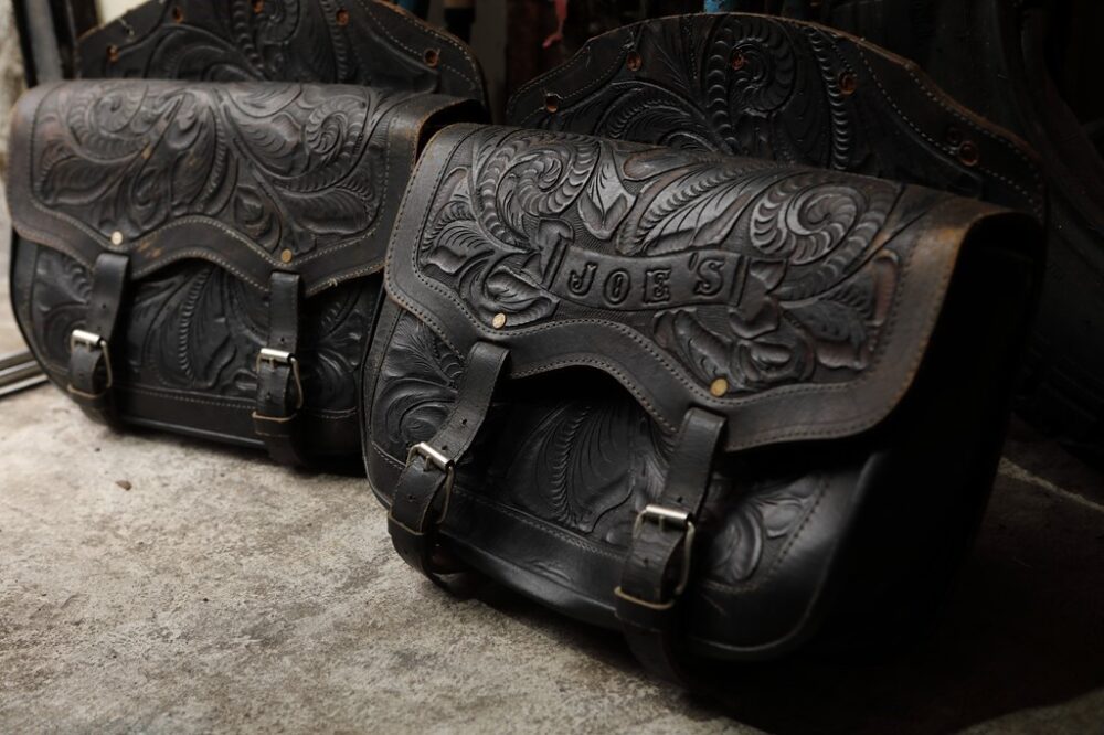 手放せないバッグとして挙げたのは、愛車に取り付ける予定のカービングサドルバッグ。「A-DAYで見つけたサドルバッグは、’70sのチョッパーに付いていたもの。詳細はわかりませんが、佇まいに惚れた」