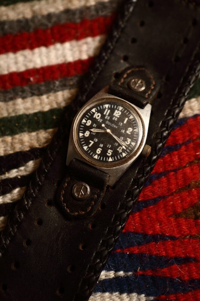 米軍に支給されていたBULOVA製のミリタリーウォッチ。「’70年代にバイク乗りの間で、この時計のストラップをカスタムして着用するのが流行。ドロップアウトする退役軍人も多かったのでしょう(笑)」