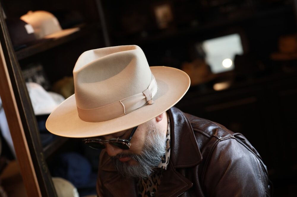 ベストなサイズで自分好みにオーダーしたティアドロップ型のハット。「160gのビーバー100%の生地で作り、素材自体が別注素材なんです。あくまでもボクが好きなフォルムで、4年前に作ったものです」