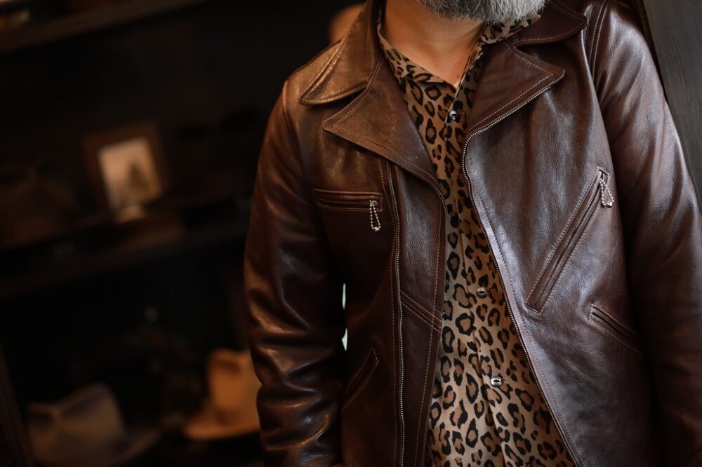 人生初のレザーライダースジャケットとして選んだのはGROOVIN HIGHの1着。「体型の大きな自分サイズが新品で買えることが嬉しくて。ゴートスキンなので着用しやすいのが気に入っています」