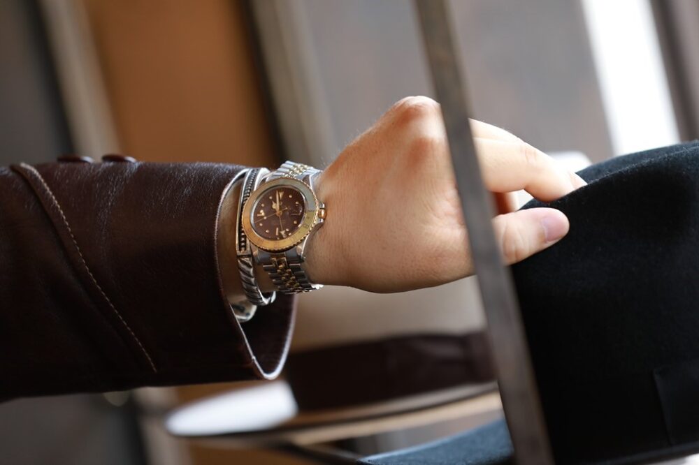このモデルを探すために3年ほど要したというROLEX。「フジツボのマットダイヤルでUSジュビリーのGMTマスター。普段ベージュとかブラウンの服装が多いので、このトーンで着けられる時計を探していました」